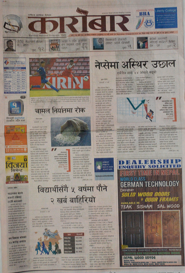 बुधवार राजधानीबाट प्रकाशित भएका आर्थिक क्षेत्रका पत्रिकाहरुले अस्थिर सेयर बजार, पर्यटन बोर्डको अनियमितता तथा उद्योग वाणिज्य महासंघ अध्यक्ष प्रदीपजंग पाण्डेको मुद्दाबारे सर्वोच्चको अन्तरिम आदेशको खबरलाई प्राथमिकताका साथ छापेका छन् ।कारोबार दैनिकले ‘नेप्सेमा अस्थिर उछाल एकैदिन साढे ४४ अंकले बढ्यो’ शीर्षकमा मुख्य खबर छापेको छ । सेयर बजारमा दैनिक ५ प्रतिशतको उतार चढाव आएको छ । आइतवार ५ प्रतिशतले घटेको परिसूचक मंगलवार पुनः सोही गतिमा बढेको छ । यस्तै, चामल निर्यातमा रोक, विद्यार्थीसँगै पाँच वर्षमा पौने दुई खर्ब बाहिरियो, वन विकास कोषको ४० करोड अलपत्र, लिलामीको समस्याले गैरबैंकिङ् सम्पत्ति थुपि्रयो, पीटीए अनुमोदन यसैसाता, दसैंका लागि आजदेखि टिकट बुकिङ् खुला लगायतका खबर कारोबार दैनिकमा छ ।