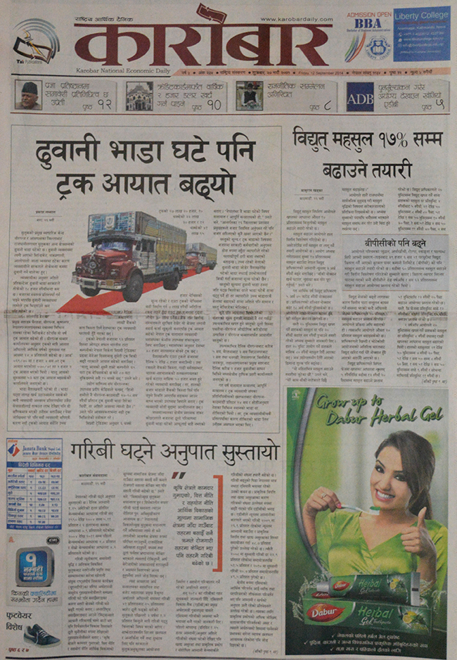 ‘गरिबी घट्ने अनुपात सुस्तायो’ शीर्षकमा आवरण पृष्ठमा खबर छापेको छ । कृषि क्षेत्रले कामदार गुमाएको, वित्त नीति र सहयोग नीति र आर्थिक विकासको मूल्यमा समाजिक क्षेत्रमा जाँदा गाउँबाट सहरमा बसाई सर्ने क्रमले रोजगारी सहरमा केन्दि्रत भए पनि सहरमै गरिबी बढेको छ । यस्तै, ढुवानी भाडा घटे पनि ट्रक आयात बढ्यो, विद्युत महसुल १७ प्रतिशत सम्म बढाउने तयारी, बुटवल पावर कम्पनीको पनि महशुल बढाउने तयारी, निगमको घाटा क मगर्न संसदीय समितिको ताकेता, चालु वर्षभित्र आईटी पार्क सञ्चालनमा, क्रेडिट कार्डमार्फत वाषिर्क २ हजार डलर खर्च गर्न पाइने लगायतको खबर कारोबारमा छ ।