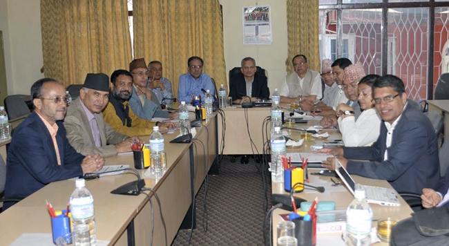 संविधानका अन्तरवस्तुबारे छलफलमा गर्न बसेको तीन दलको शीर्ष नेताहरूको बैठक । तस्वीरः डा. बाबुराम भट्टरार्इको फेसबुकबाट काठमाडौं । संघीय प्रदेशहरुको संख्याबारे दलहरुले आ-आफ्नै अडान दोहोर्याएपछि निर्णायक भनिएको प्रमुख तीन दलको वार्ता विफल भयो । तर, साँझ बालुवाटारमा बसेको चार दलको बैठकले सर्वपक्षीय राजनीतिक सभा गर्ने सहमति गरेपछि संविधानसभाको कार्यतालिका परिवर्तन हुने प्रायः निश्चित भएको छ ।