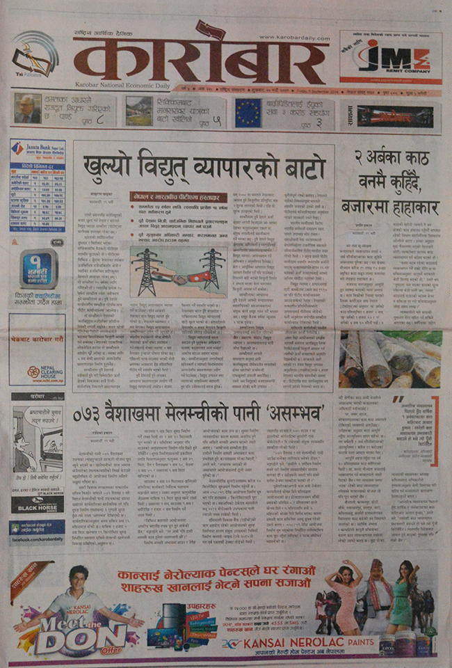 ‘खुल्यो विद्युत ब्यापारको बाटो’ शीर्षकमा मुख्य खबर छापेको छ । लामो प्रयत्नपछि जलविद्युतको बजार खुला गर्न नेपाल र भारतले विद्युत ब्यापार सम्झौता (पीटीए)मा प्रारम्भिक हस्ताक्षर गरेका छन् । यस्तै, ०७३ वैशाखमा मेलम्चीको पानी ‘असम्भव’, दुई अर्बको काठ वनमै कुहिंदै, बजारमा हाहाकार, फ्याक्ट लघु अनुदानका लागि २ अर्ब १६ करोड, बाढीपीडितलाई ईयूको सवा ३ करोड सहयोग, क्यान सफ्टेकको अनलाइन टिकटमा २० प्रतिशत छुट, नेप्से १२ अंकले घट्यो लगायतको खबर कारोबार दैनिकमा छ ।